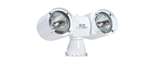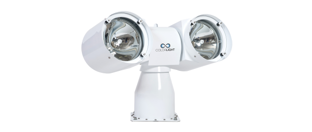 The product family CL25 is a medium size powerful searchlight that is based on HMI light technology. The dual head can be configured with dual white HMI, a combination white and UV or with dual UV. Pls find more information in the navigation to the right. In combination with the special designed parabolic reflector this searchlight gives an extraordinary light performance. The high color temperature in combination with the high color spectra (CRI) gives an impression of clear daylight with good contrasts of objects It also has high color rendering which is highly appreciated among mariners all over the world. The patented unlimited movement functionality offers limitless operational freedom. In combination with the intelligent control system it is possible to control many searchlights and control panels in network. The system is also open to be integrated with other systems onboard. The mechanical concept is very solid and all mechanical structure is embedded inside the housing. This reduce problems coming from external influences like ice or corrosion. The housing itself is made in acid proof stainless steel and withstand the extreme tough marine environment. The CL25 is very flexible in terms of installation – the housing can be installed standing or hanging upside down. Also HMI technology is not sensitive for any burning position so the light performance is not affected in any direction.